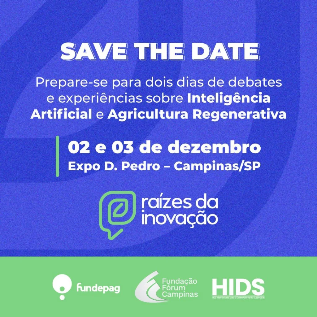 Com o objetivo de ampliar a conexão entre ciência, mercado e setor produtivo, a Fundação de Desenvolvimento da Pesquisa do Agronegócio (Fundepag) promove, nos dias 2 e 3 de dezembro, o Congresso Raízes da Inovação, no Expo Dom Pedro, em Campinas (SP). No primeiro dia, a programação abordará o desenvolvimento e a aplicação da inteligência artificial em setores como agronegócio e farmácia, além de temas relacionados à legislação e regulação, financiamento, infraestrutura tecnológica, inovação aberta, rastreabilidade, certificação e descarbonização agroambiental. No segundo dia, o foco será a agricultura regenerativa, com a apresentação de projetos já em andamento pela Fundepag e parceiros, entre eles o HUB Internacional para o Desenvolvimento Sustentável (HIDS) (https://portal.fundepag.br).