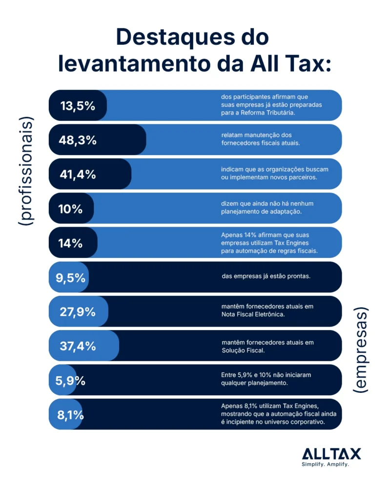 A Reforma Tributária, que entra em vigor em janeiro, promete ser um divisor de águas para o ambiente de negócios no Brasil. Mais do que adequação regulatória, especialistas apontam que ela impõe às empresas a necessidade de transformar a gestão fiscal em área estratégica — capaz de sustentar competitividade, margens e inovação. O estudo inédito “Reforma Tributária – dualidade entre conservadorismo e inovação nas empresas brasileiras”, realizada pela All Tax com 408 profissionais respondentes, representando 222 empresas, revela um cenário marcado por contrastes: apenas 13,5% dos participantes consideram que suas companhias estão prontas para as mudanças, enquanto mais de 40% apontam que ainda buscam ou implementam novas soluções.