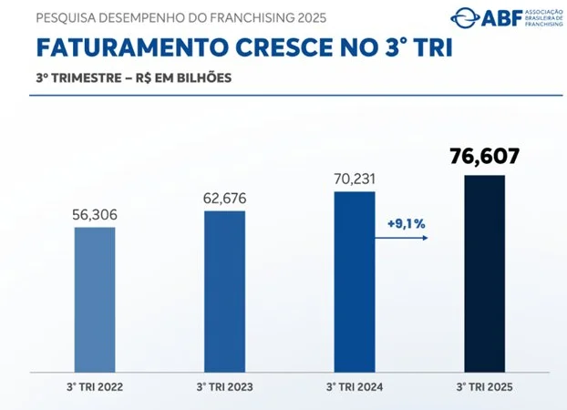 A Pesquisa de Desempenho Trimestral do Franchising referente ao período de julho a setembro de 2025 envolveu uma base amostral com 409 redes respondentes que representam aproximadamente 40% do faturamento e 31% das operações de franquias. Abrangendo o mercado como um todo, inclusive não associados, os números do desempenho do franchising são apurados em pesquisa por amostragem, cruzados com levantamentos feitos por entidades representantes de setores correlatos ao sistema de franquias, órgãos de governo, instituições parceiras e de ensino. Auditados por empresa independente, os dados divulgados pela ABF são referência para órgãos governamentais de diversas esferas, entidades internacionais do franchising, como World Franchise Council (WFC), Federação Ibero-Americana de Franquias (FIAF) e instituições financeiras.