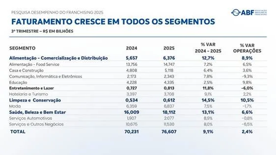 Todos os 12 segmentos do franchising registraram alta do faturamento no terceiro trimestre de 2025. O maior avanço foi registrado em Limpeza e Conservação, com 14,5%. Entre os principais fatores, o segmento se destacou pela transformação habitacional, especialmente nas grandes cidades, com a opção das pessoas por lares mais compactos e ambientes reduzidos; escassez de mão de obra, com aumento da contratação de serviços externos especializados, e pela mudança de comportamento do consumidor, que busca por praticidade e experiências de maior qualidade no serviço.
