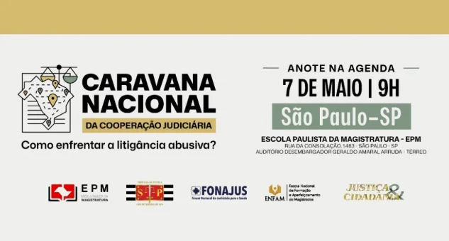 A Revista Justiça & Cidadania promove, com o apoio do Fórum Nacional do Judiciário para a Saúde (Fonajus) e da Escola Nacional de Formação e Aperfeiçoamento de Magistrados (Enfam), no dia 7 de maio, a 12ª edição da Caravana Nacional da Cooperação Judiciária, com início às 9h, na sede da Escola Paulista da Magistratura (EPM), em São Paulo. O evento contará com a participação, entre outras autoridades, do ministro do Supremo Tribunal Federal Luiz Fux; do corregedor nacional de Justiça, ministro Mauro Campbell Marques; do presidente do Tribunal de Justiça do Estado de São Paulo (TJSP), desembargador Francisco Eduardo Loureiro; da corregedora-geral de Justiça do TJSP, desembargadora Silvia Rocha; do diretor da EPM, desembargador Ricardo Cunha Chimenti; e da juíza auxiliar da Vice-Presidência do Superior Tribunal de Justiça (STJ), Daniela Madeira, coordenadora acadêmica da Caravana. Inscrições: https://lnk.bio/s/jc_revista/CaravanaSP_7maio.