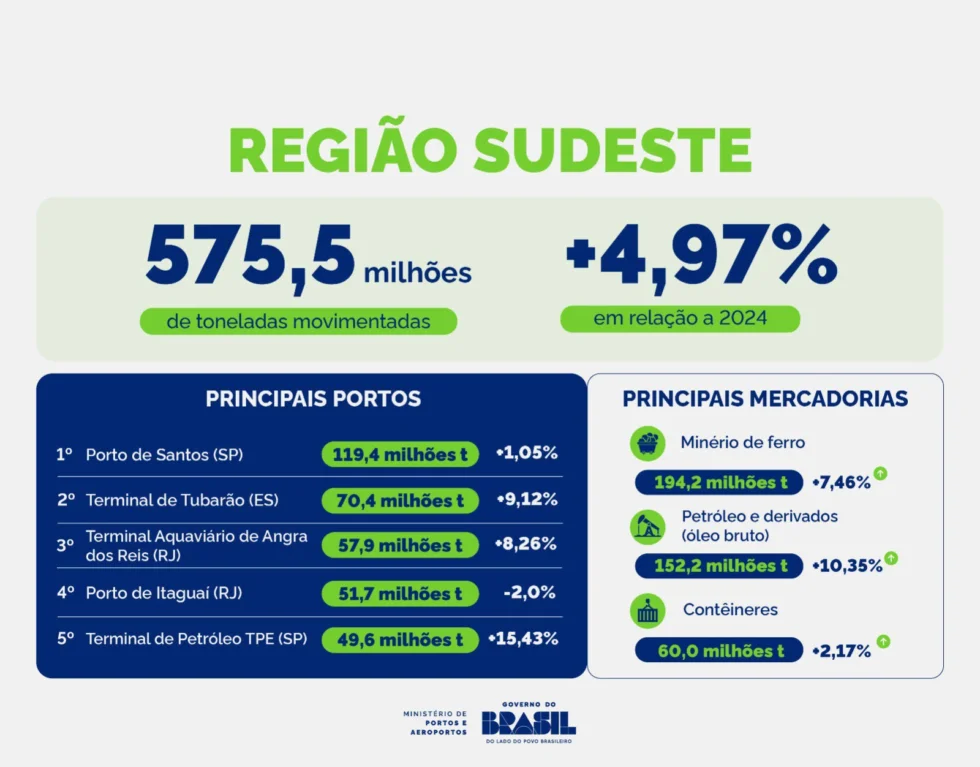 A movimentação de cargas nos portos da região Sudeste alcançou 575,5 milhões de toneladas entre janeiro e outubro de 2025, segundo dados da Agência Nacional de Transportes Aquaviários (Antaq). O volume representa crescimento de 4,97% em relação ao mesmo período de 2024, mantendo o Sudeste como principal eixo logístico do Brasil e movimentando os maiores volumes de cargas no sistema portuário nacional. O desempenho regional foi sustentado principalmente pelos granéis sólidos, que somaram 299,7 milhões de toneladas, com alta de 4,20% frente a 2024. Os granéis líquidos alcançaram 187,3 milhões de toneladas, registrando crescimento de 7,74%, fortemente influenciados pela movimentação de petróleo e derivados. Já as cargas em contêineres responderam por 60 milhões de toneladas, com expansão de 2,17%, enquanto a carga geral atingiu 28,6 milhões de toneladas, crescimento de 1,60% em relação a 2024.