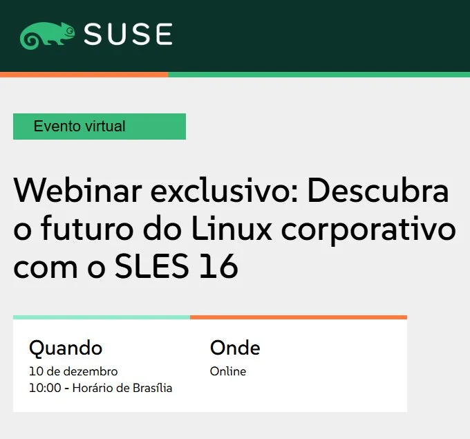 @Recém-lançado, o SUSE Linux Enterprise Server 16 (SLES 16) chega ao mercado como o primeiro Linux corporativo do setor a integrar IA agêntica, ampliando segurança, autonomia e eficiência operacional. Para aprofundar os recursos da nova versão, a SUSE promove no dia 10 de dezembro, às 10h, o webinar gratuito “Descubra o futuro do Linux corporativo com o SLES 16”. O encontro apresentará avanços em desempenho, soberania digital, continuidade de negócios e a flexibilidade “Anywhere and Any Way”, projetada para ambientes híbridos, nuvem, borda e contêineres (https://more.suse.com/BR_SLES_16_Webinar_Release_LandingPage.html).