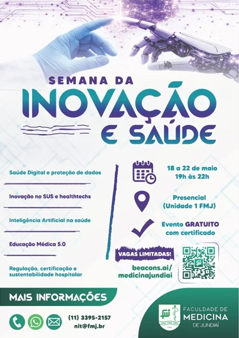 @A Faculdade de Medicina de Jundiaí (FMJ) realiza, de 18 a 22 de maio de 2026, a Semana da Inovação e Saúde, evento gratuito que vai reunir estudantes, profissionais e empresas em torno de um dos temas mais estratégicos da atualidade: o futuro da saúde. O evento contará com palestras, painéis e debates e será realizado no período noturno, reunindo especialistas convidados para discutir tecnologia, empreendedorismo e soluções inovadoras aplicadas à área, especialmente em termos de saúde digital e proteção de dados, inovações no SUS e healthtechs, inteligência artificial na saúde, educação médica 5.0 e regulação, certificação e sustentabilidade hospitalar. As inscrições podem ser feitas pelo link: https://www.even3.com.br/semanainovacao2026-706193/; mais informações pelo email [email protected] ou pelo telefone: (11) 3395-2157.