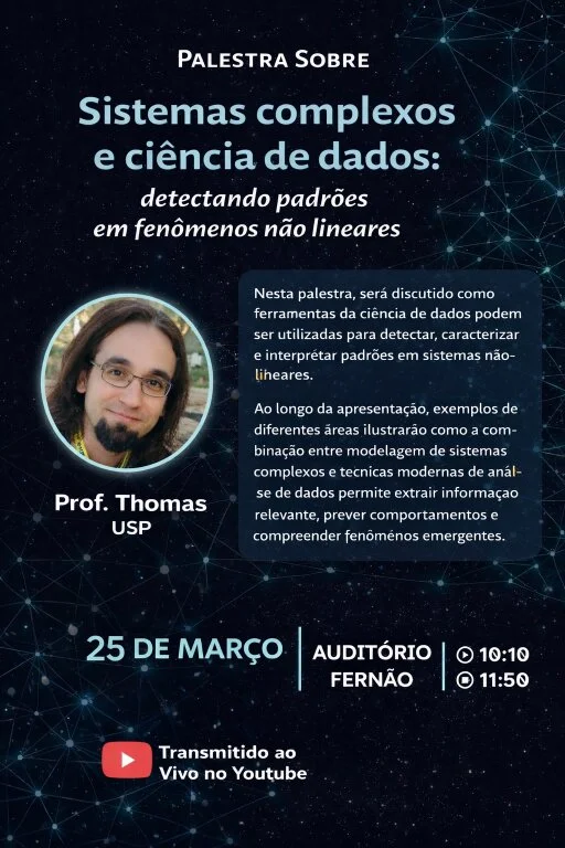 O cérebro, a economia e até mesmo a sociedade são exemplos de sistemas complexos, nos quais múltiplos elementos interagem entre si e produzem comportamentos difíceis de prever. Compreender esses padrões é um desafio da Ciência de Dados e será o tema da palestra Sistemas Complexos e Ciência de Dados: Detectando Padrões em Fenômenos Não Lineares, ministrada pelo professor Thomas Kauê Dal’Maso Peron, do Instituto de Ciências Matemáticas e de Computação (ICMC) da USP, em São Carlos. O evento é gratuito e acontece no dia 25 de março de 2026, em formato híbrido. Os residentes de São Carlos podem assistir no Auditório Fernão Stella de Rodrigues Germano, localizado no Bloco 6 do ICMC. Para pessoas de outras localidades, será possível acompanhar ao vivo pelo canal ICMC TV no YouTube. A transmissão terá início às 10h10, com previsão de término às 11h50.