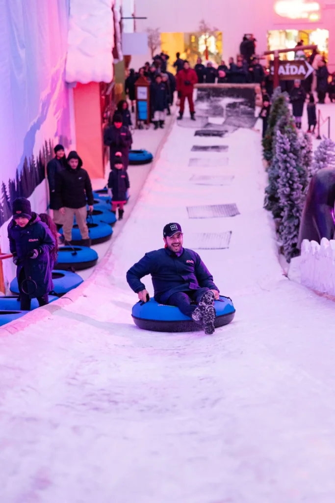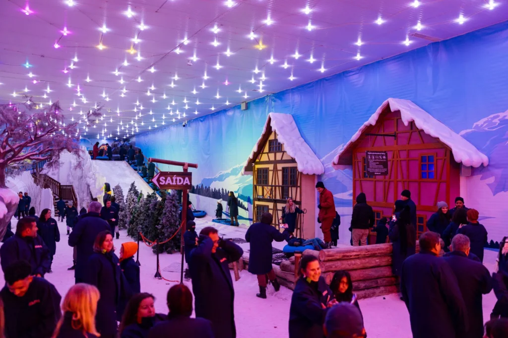 Para quem quer viver outro clima, o Alles Park também aposta no contraste. Na Vila da Neve, as temperaturas podem chegar a 10 graus negativos, e muitos visitantes realizam o sonho de conhecer e brincar na neve. O cenário lembra uma vila nas montanhas, e a diversão não tem idade: crianças e adultos deslizam em boias no tubing de neve, exploram uma mina abandonada com clima de mistério e ainda registram o passeio com fotos feitas pela equipe do parque.