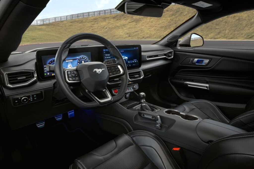 Internamente, o carro combina tecnologia com bancos Recaro, painel digital de 12,4”, sistema multimídia Sync 4, som Bang & Olufsen e diversos recursos de segurança, como sete airbags, frenagem autônoma, monitoramento de ponto cego e piloto automático adaptativo.